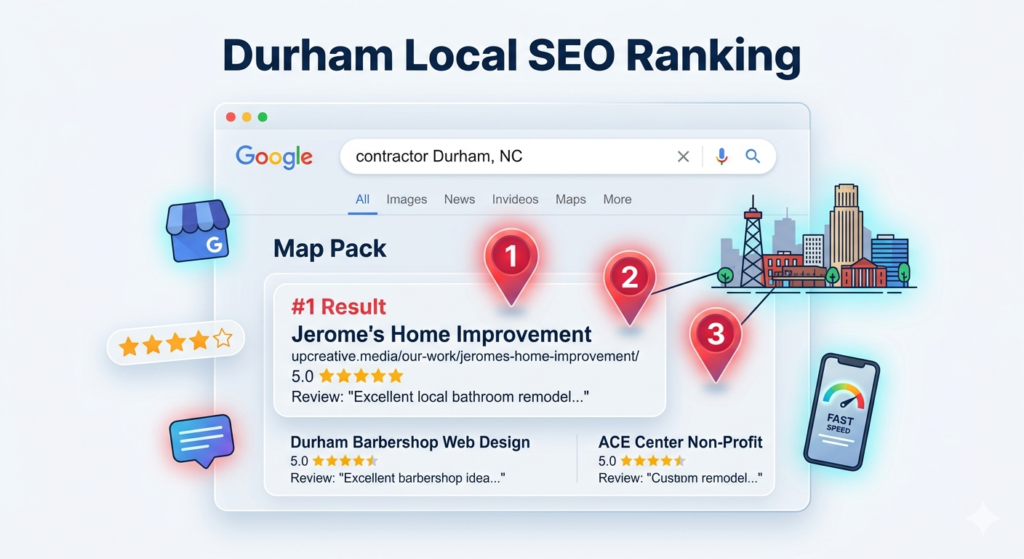 When someone in the Bull City types “best plumber near me” or “roofing contractor in Durham,” Google doesn’t just show them random websites. It shows them the “Map Pack”—the top three local businesses with pins on the map. Your Durham local SEO ranking is simply your position in that specific list.